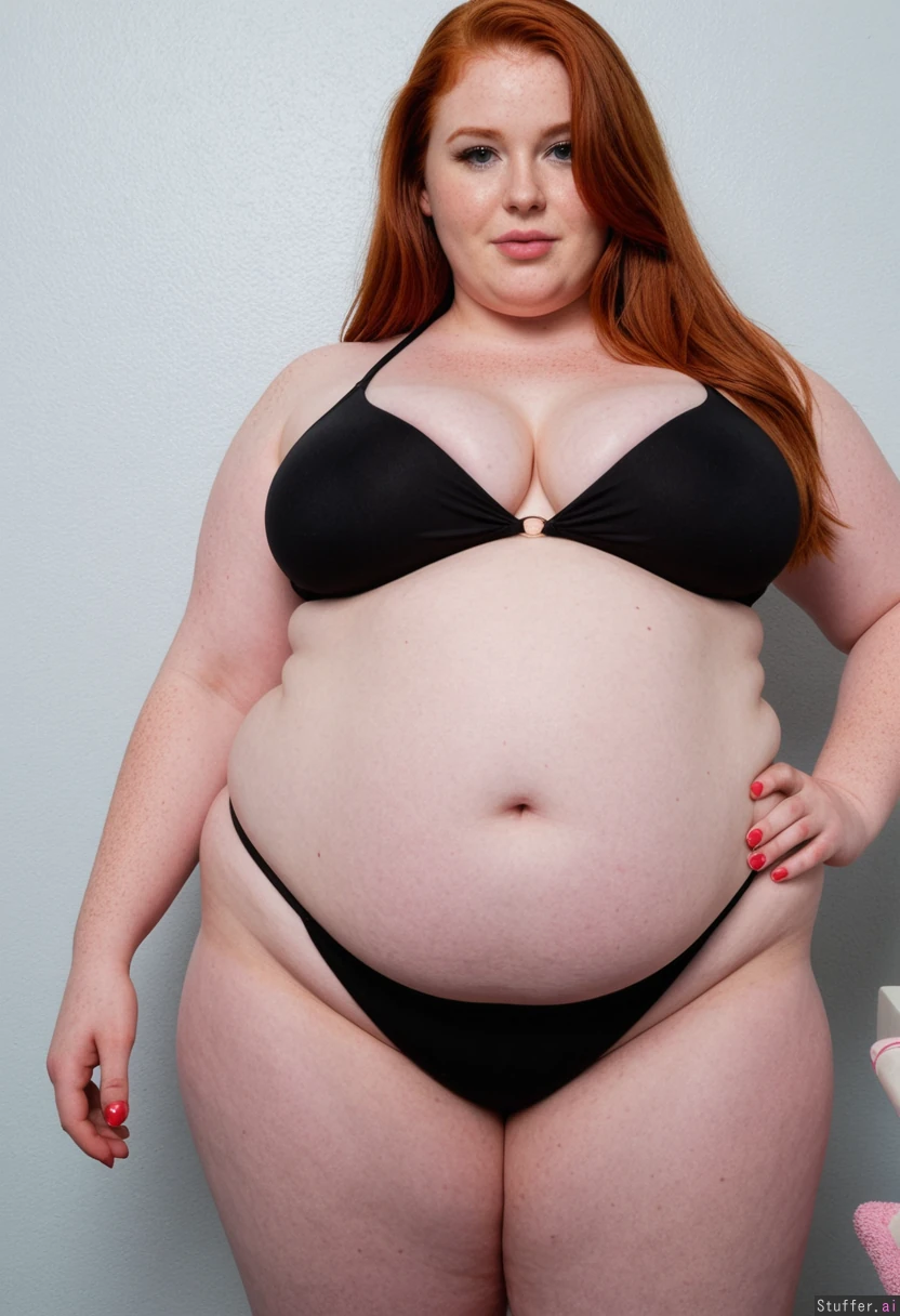 Redhead in a black bikini, pretty face, (Hyper weight gain, hyper wide hips, belly rolls:1.2)