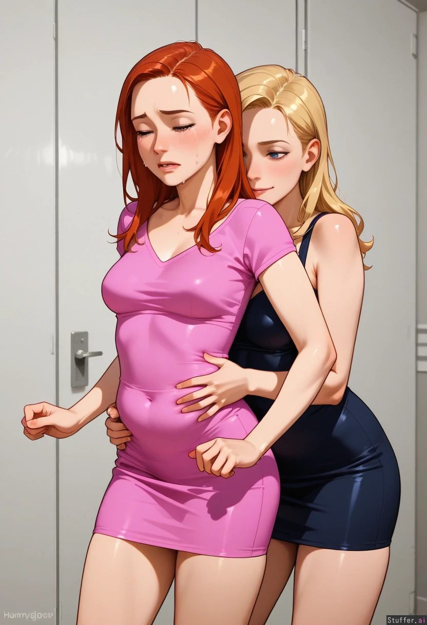 lesbian_couple, yuri, squeezing_belly, aroused, horny, crying, red_hair, blonde_hair, ((chubby_belly: 0.8)), round belly, skinny face, skinny arms, medium breasts, Short tight Dress too small