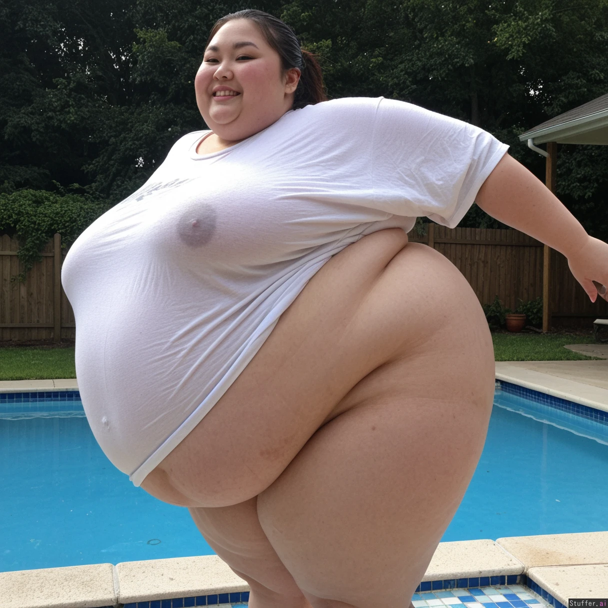 (((1girl, Asian ussbbw, ssbbw, thick thighs, extremely overweight, immobile, big loose wet tshirt, weight gain))), correct anatomy, standing, smiling, looking up, side view, bbw, gigantic belly, full belly, innie navel, shorts, topless, poolside, dawn, belly rub, fat arms