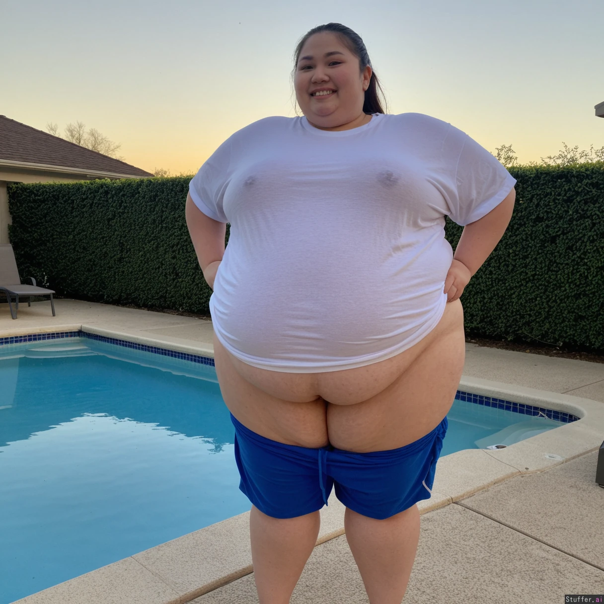 (((1girl, Asian ussbbw, ssbbw, thick thighs, extremely overweight, immobile, big loose wet tshirt and shortpants, weight gain))), correct anatomy, standing, smiling, looking up, side view, bbw, gigantic belly, bloated belly, innie navel poolside, dawn, belly rub, fat arms