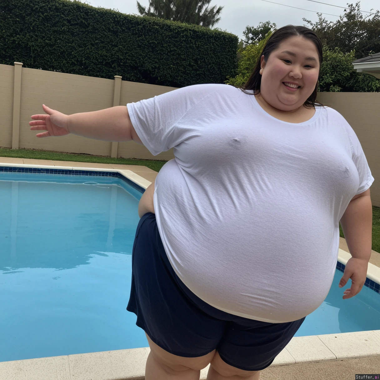 (((1girl, Asian ussbbw, ssbbw, thick thighs, extremely overweight, immobile, big loose wet tshirt and shortpants, weight gain))), correct anatomy, standing, smiling, looking up, side view, bbw, gigantic belly, bloated belly, innie navel poolside, dawn, belly rub, fat arms