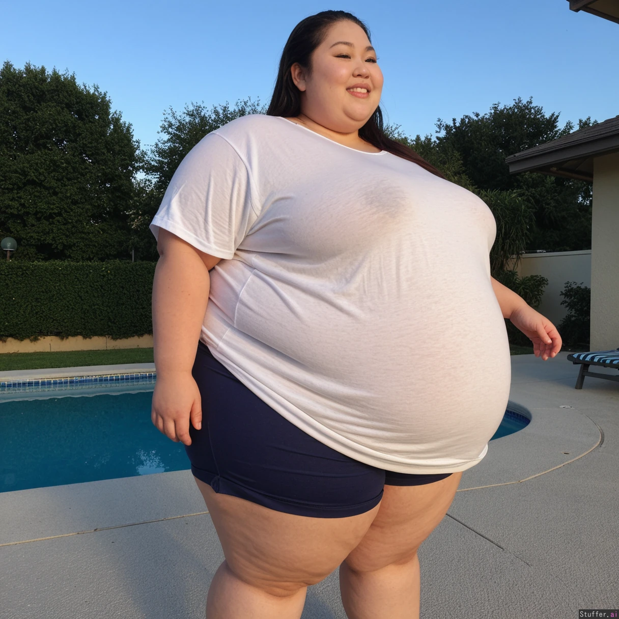 (((1girl, Asian ussbbw, ssbbw, thick thighs, extremely overweight, immobile, big loose wet tshirt and shortpants, weight gain))), correct anatomy, standing, smiling, looking up, side view, bbw, gigantic belly, bloated belly, innie navel poolside, dawn, fat arms