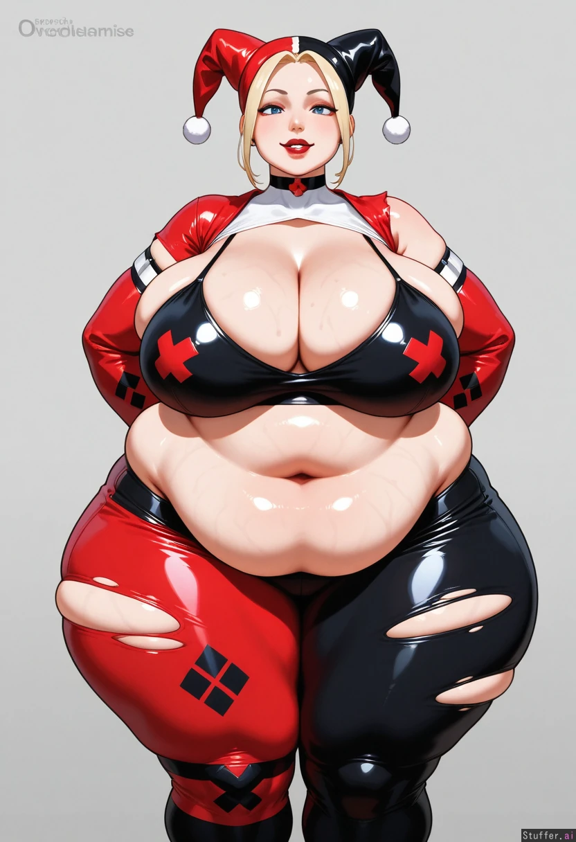 (Overmassive) (overobese) (hyper obese) (immobile) (massive) (fat neck doublechin) (overmassise belly) (fat face) Harley Quinn (dc) (stretch marks) (overmassise fat rolls) (cellulite) (tight clothes) (ripped clothes)