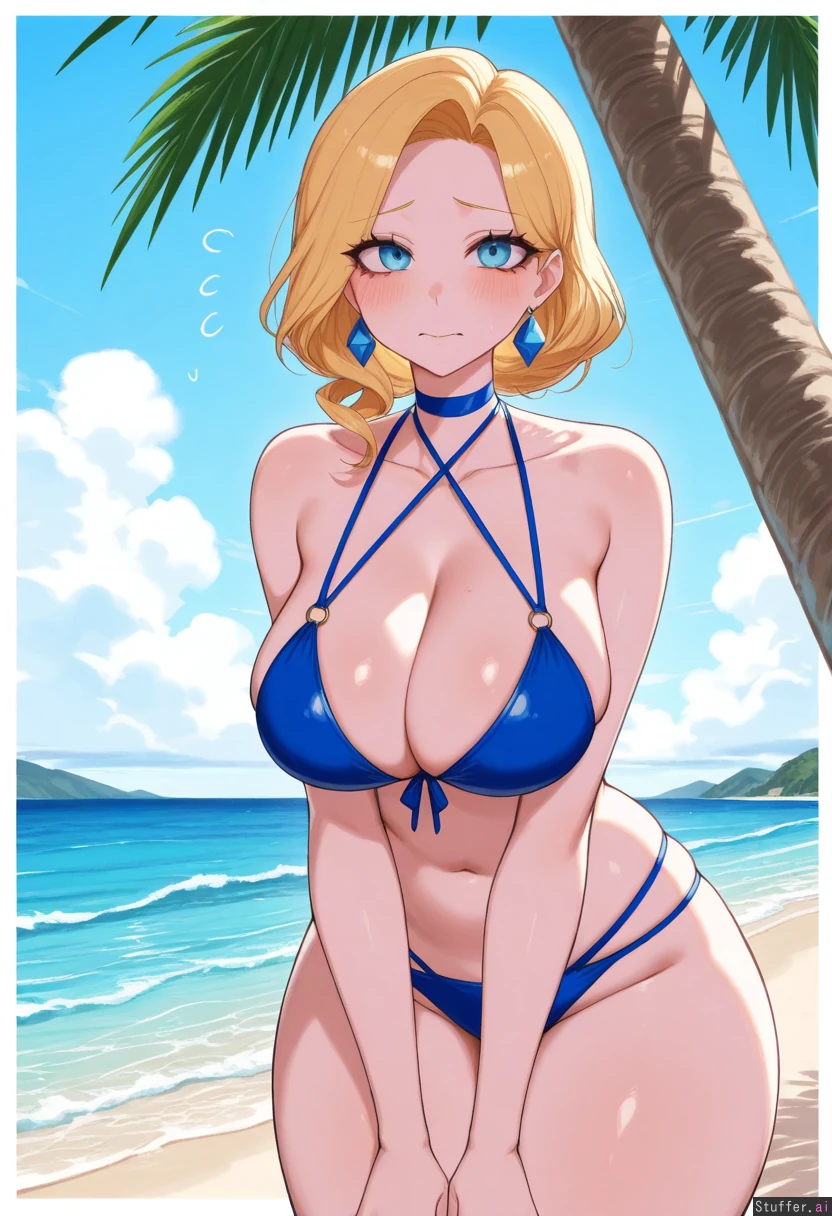 (((solo, 1woman))), ((adult woman:1.4)), usa37107692(artist), Beautiful blonde bride on her honeymoon (Caribbean island background, bright sandy beach, palm trees, blue water, waves in background), (self-deprecating, submissive, flirty, timid, uncertain, nervous),