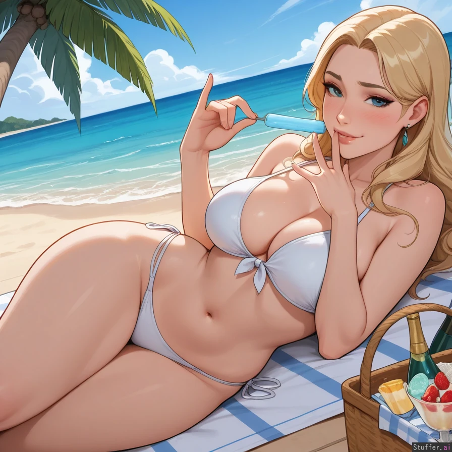 (((solo, 1woman))), ((adult woman:1.4)), (pewbutt(artist):1.5), (KAMII MOMORU(artist):1.1), (kittew(artist):1.0), (reiq(artist)), Beautiful blonde bride on her honeymoon. (white bikini) (drinking champagne) (drunk) (eating dessert: 1.3) Sitting on a towel at the beach. (picnic basket full of food, bottle of champagne) (lounging, relaxed) (sweet smile) front view (Caribbean island background, bright sandy beach, palm trees, blue water, waves in background), (self-deprecating, submissive, flirty, timid, uncertain, nervous),