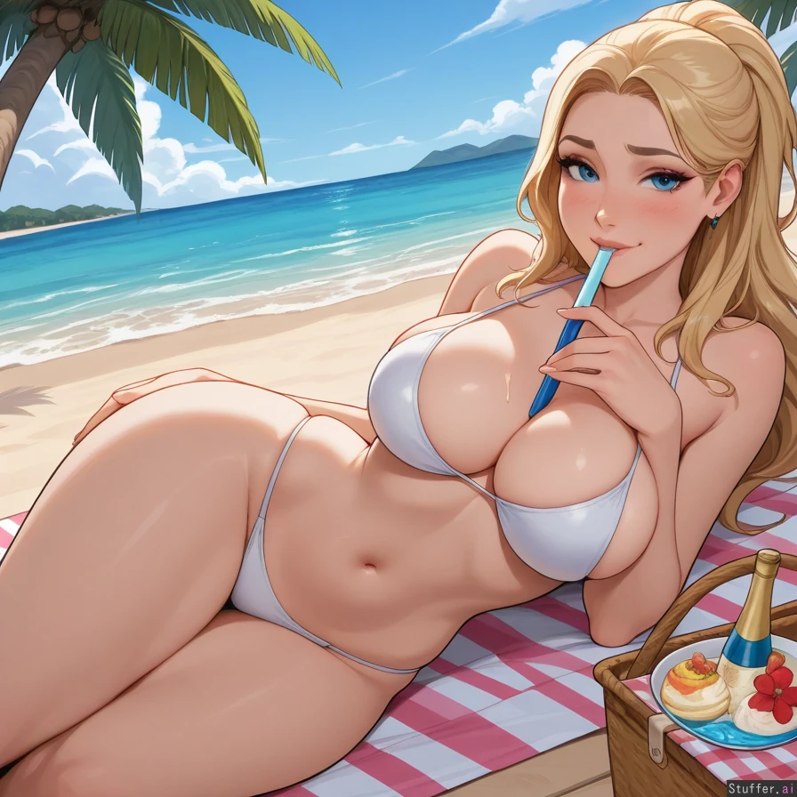 (((solo, 1woman))), ((adult woman:1.4)), (pewbutt(artist):1.5), (KAMII MOMORU(artist):1.1), (kittew(artist):1.0), (reiq(artist)), Beautiful blonde bride on her honeymoon. (white bikini) (drunk) (eating dessert: 1.4) (glutton) Sitting on a towel at the beach. (picnic basket full of food, bottle of champagne) (lounging, relaxed) (sweet smile) front view (Caribbean island background, bright sandy beach, palm trees, blue water, waves in background), (self-deprecating, submissive, flirty, timid, uncertain, nervous),