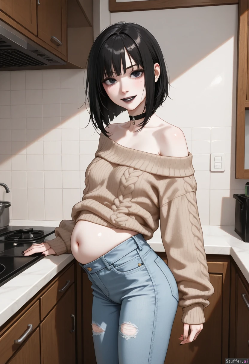 Standing in cozy warmly lit small kitchen with table highly realistic, detailed eyes, solo female, ((emo)), black lipstick, beautiful caucasian, female, instagram model, (very white pale skin), perfect face, slim face, dark eyes, soft jawline, (black hair, messy bob, medium hair, messy bangs), narrow shoulders, (facing viewer), (looking at viewer), freckles, heavy dark eye makeup ((Beige knit offshoulder sweater, low cut)), (low rise grey skinny_jeans), choker, (((fully clothed))), (Slim, narrow waist), (smile), parted lips, sensual, (bloated belly), (side view:1.1)