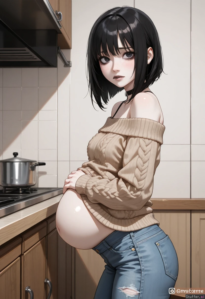 Standing in cozy warmly lit small kitchen with table highly realistic, detailed eyes, solo female, ((emo)), black lipstick, beautiful caucasian, female, instagram model, (very white pale skin), perfect face, slim face, dark eyes, soft jawline, (black hair, messy bob, medium hair, messy bangs), narrow shoulders, (facing viewer), (looking at viewer), freckles, heavy dark eye makeup ((Beige knit offshoulder sweater, low cut)), (low rise grey skinny_jeans), choker, (((fully clothed))), (Slim, narrow waist), struggling, worried face, sensual, (bloated belly), (side view:1.1), hand on stomach, stomachache