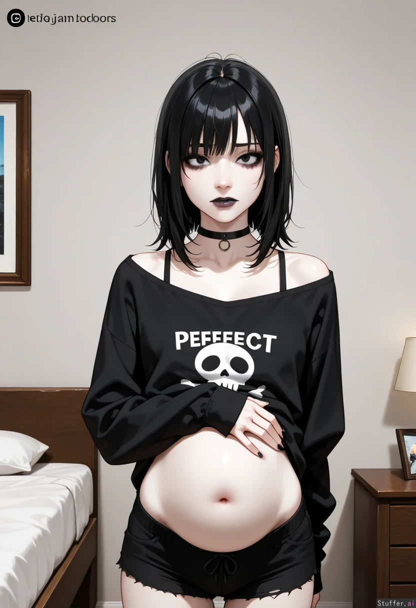 in bedroom, highly realistic, detailed eyes, solo female, ((emo)), black lipstick, beautiful caucasian, female, instagram model, (very white pale skin), perfect face, slim face, dark eyes, soft jawline, (black hair, messy bob, medium hair, messy bangs), narrow shoulders, (facing viewer), heavy dark eye makeup, choker, pyjamas top, pyjama bottoms, (Slim, narrow waist), struggling, worried face, sensual, (large bloated belly), hand on stomach,