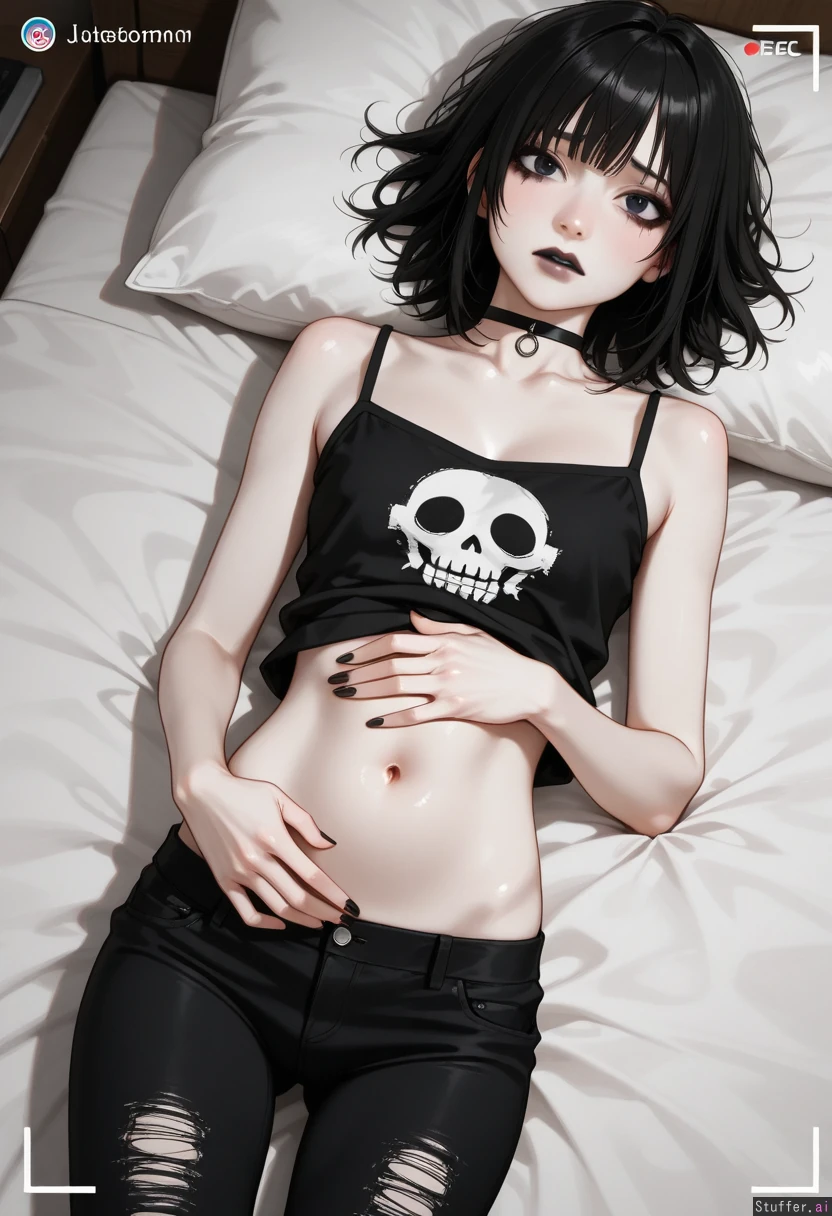 bedroom, highly realistic, detailed eyes, solo female, ((emo)), black lipstick, beautiful caucasian, female, instagram model, (very white pale skin), perfect face, slim face, dark eyes, soft jawline, (black hair, messy bob, medium hair, messy bangs), narrow shoulders, (facing viewer), heavy dark eye makeup, choker, pyjamas top, pyjama bottoms, (Slim, narrow waist), struggling, worried face, sensual, (large bloated belly), hand on stomach, laying on bed