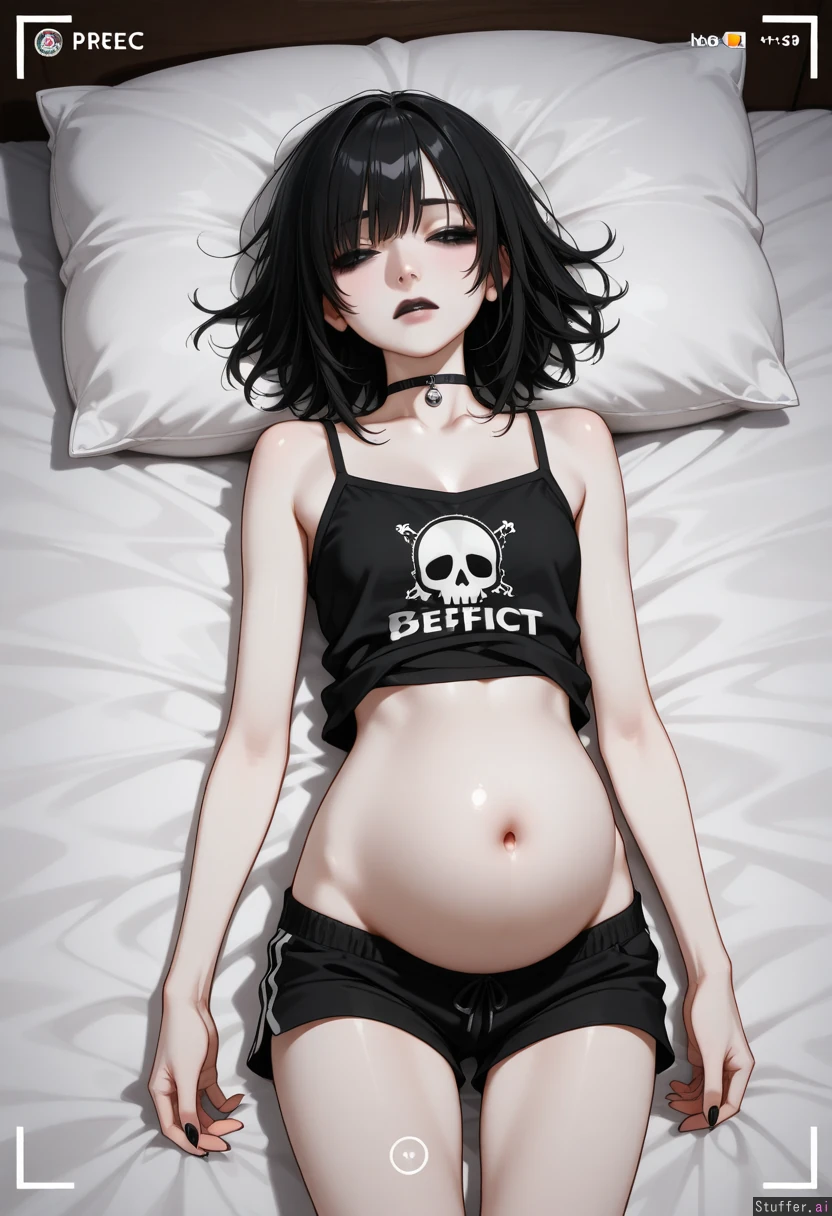 bedroom, highly realistic, detailed eyes, solo female, ((emo)), black lipstick, beautiful caucasian, female, instagram model, (very white pale skin), perfect face, slim face, dark eyes, soft jawline, (black hair, messy bob, medium hair, messy bangs), narrow shoulders, (facing viewer), heavy dark eye makeup, choker, pyjamas top, pyjama bottoms, (Slim, narrow waist), struggling, worried face, sensual, (large bloated belly),laying on bed, sleeping, eyes closed