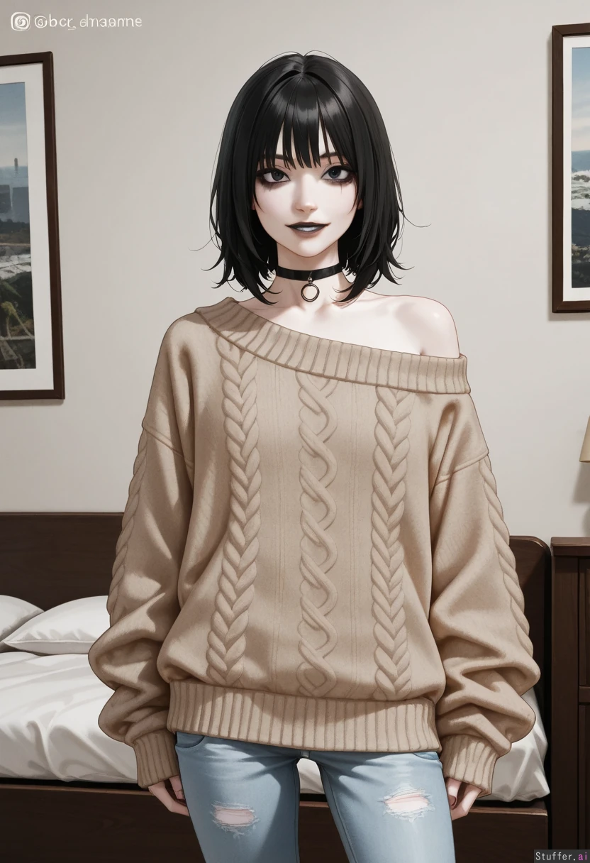 Standing in bedroom, highly realistic, solo female, ((emo)), black lipstick, beautiful caucasian, female, instagram model, (very white pale skin), perfect face, slim face, dark eyes, soft jawline, (black hair, messy bob, medium hair, messy bangs), narrow shoulders, (facing viewer), (looking at viewer), heavy dark eye makeup ((Beige knit offshoulder sweater, low cut)), (low rise grey skinny_jeans), choker, (((fully clothed))), (Slim, narrow waist), (smile), parted lips, sensual,