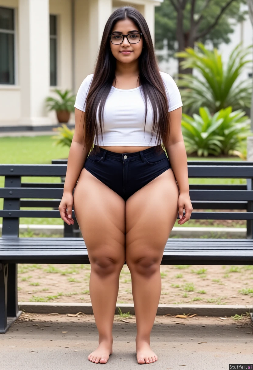 Make her short enough to fit her whole body in frame, fatter hips, thicker thighs, extremely wide hips, hyper wide hips, extra chubby, Sri Lankan, goddess, nerd, beautiful feet, long hair