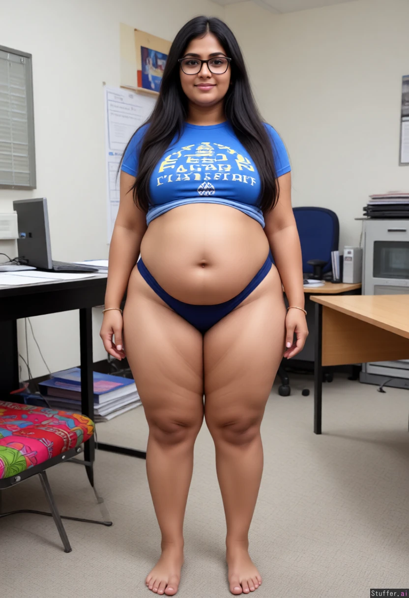 Make her short enough to fit her whole body in frame, fatter hips, thicker thighs, extremely wide hips, hyper wide hips, extra chubby, Sri Lankan, goddess, nerd, beautiful fat feet, long hair, bulging belly, bellyheavy