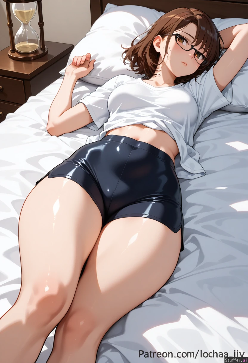 Athletic anime girl with glasses, (chubby:0.2), perfect proportions, brown hair, thick thighs, thick ass, hourglass body, medium breasts, laying lazily on the bed, wearing tight shorts, loose shirt, on her back, relaxed