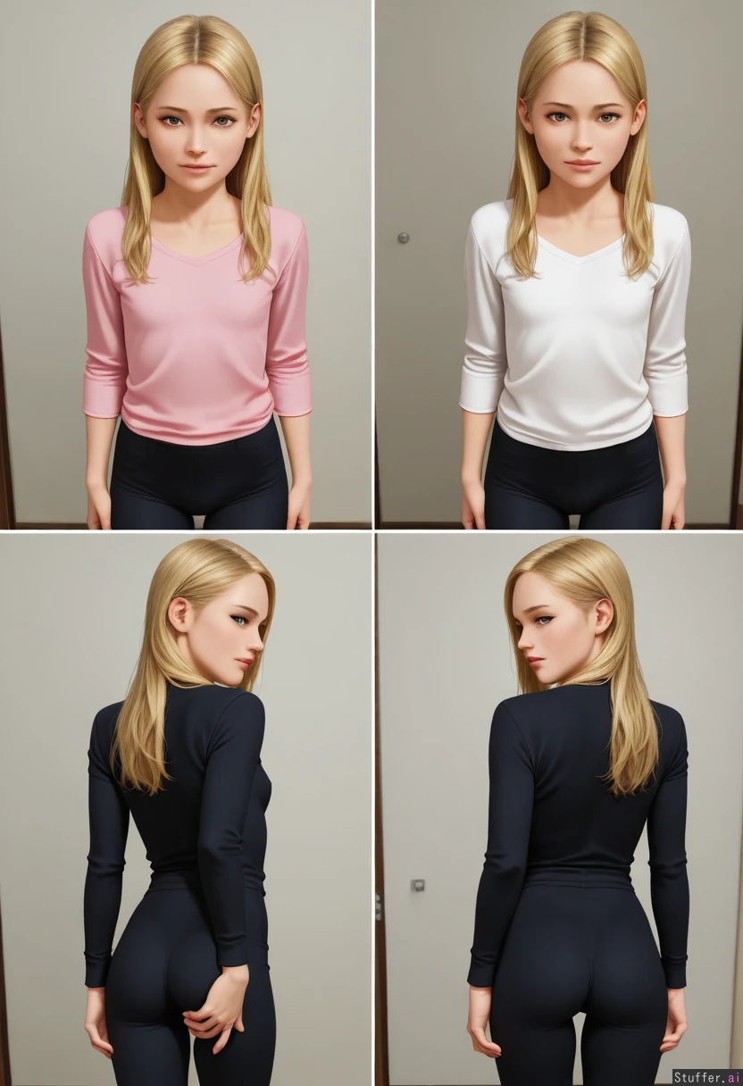 Realistic, little, slim, blonde, throwing little ass around for daddy, tight angle, looking_at_viewer, detailed face, multiple_views