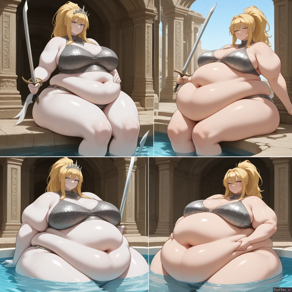 (highly detailed, best quality), (perfect anatomy, perfect proportions), beautiful face, beautiful eyes, dynamic pose,majestic graceful queen of the night zenobia,(blond high straight ponytail 3.0) ,(((detailed brigth emerald eyes))), Thin_eyes, narrow eyes,(((pure white color skin))), larger_female,bright expression(High quality, ultra high definition, 8k, masterpiece, perfect hands and fingers, (((perfect clear eyes))), incredible shading and lighting),big lavish crown jewels all over her body, bellyheavy, exquisite lighting, full body, ((low hanging massive belly)), (((big_very_tall))),larger female, adult, (((flabby_enlarged_belly,fat_belly,double belly))),((( flabby_deep_fat_rolls_))) larger_female,((soft_arms,fat_arms)), obese,, ,((((silver_metallic_chainmail )))), (((, hyper plump, morbidly obese,fat arms,belly_rolls,fat_rolls ))), (((tall))), adult, ( (( massive double belly)),(((has a flabby_waist with deep fat_rolls_))) //Action// ((( weight gain progression from slim to chubby to fat to massiv ,front view panel, side view panel,comparison ))), (((rubbing belly))) ,(((wink))),((( sitting in pool in ancient eastern ruins))), swimming,((( partially submerged))),(((holding_sword,holding long_silver_sword))),(((not more than one navel))),(perfect anatomy, perfect proportions)