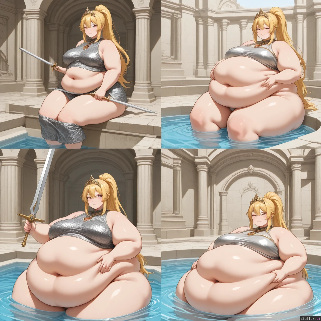 (highly detailed, best quality), (perfect anatomy, perfect proportions), beautiful face, beautiful eyes, dynamic pose,majestic graceful queen of the night zenobia,(blond high straight ponytail 3.0) ,(((detailed brigth emerald eyes))), Thin_eyes, narrow eyes,(((pure_white_color_skin))), larger_female,bright expression(High quality, ultra high definition, 8k, masterpiece, perfect hands and fingers, (((perfect clear eyes))), incredible shading and lighting),big lavish crown jewels all over her body, bellyheavy, exquisite lighting, full body, ((low hanging massive belly)), (((big_very_tall))),larger female, adult, (((flabby_enlarged_belly,fat_belly,double belly))),((( flabby_deep_fat_rolls_))) larger_female,((soft_arms,fat_arms)), obese,, ,((((silver_metallic_chainmail )))), (((, hyper plump, morbidly obese,fat arms,belly_rolls,fat_rolls ))), (((tall))), adult, ( (( massive double belly)),(((has a flabby_waist with deep fat_rolls_))) //Action// ((( weight gain progression from slim to chubby to fat to massiv ,front view panel, side view panel,comparison ))), (((rubbing belly))) ,(((wink))),((( sitting in pool in ancient eastern ruins))), swimming,((( partially submerged))),(((holding_sword,holding long_silver_sword))),(((not more than one navel))),(perfect anatomy, perfect proportions)