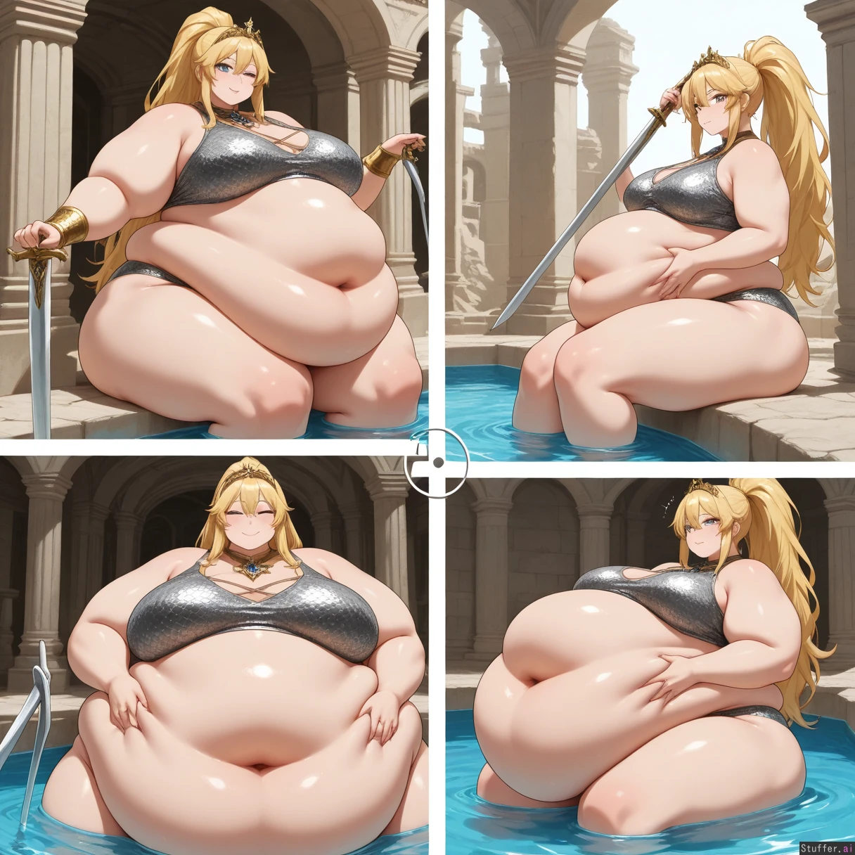 (highly detailed, best quality), (perfect anatomy, perfect proportions), beautiful face, beautiful eyes, ((( dynamic pose))),majestic graceful queen of the night zenobia,(blond high straight ponytail 3.0) ,(((detailed brigth emerald eyes))), Thin_eyes, narrow eyes,(((pure_white_color_skin))), larger_female,bright expression(High quality, ultra high definition, 8k, masterpiece, perfect hands and fingers, (((perfect clear eyes))), incredible shading and lighting),big lavish crown jewels all over her body, bellyheavy, exquisite lighting, full body,((low hanging massive belly)), (((big_very_tall))),larger female, adult, (((flabby_enlarged_belly,fat_belly,double belly))),((( flabby_deep_fat_rolls_))) larger_female,((soft_arms,fat_arms)), obese,, ,((((silver_metallic_chainmail )))), (((, hyper plump, morbidly obese,fat arms,belly_rolls,fat_rolls ))), (((tall))), adult, ( (( massive double belly)),(((has a flabby_waist with deep fat_rolls_))) //Action// ((( weight gain progression from slim to chubby to fat to massiv ,front view panel, side view panel,comparison ))), (((rubbing belly))) ,(((wink))),((( sitting in pool in ancient eastern ruins))), swimming,((( partially submerged))),(((holding_sword,holding long_silver_sword))),(((not more than one navel))),(perfect anatomy, perfect proportions)