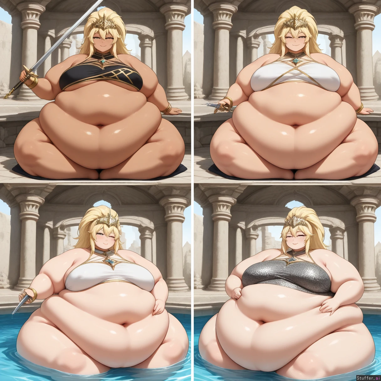 (highly detailed, best quality), (perfect anatomy, perfect proportions), beautiful face, beautiful eyes, ((( dynamic pose))),majestic graceful queen of the night zenobia,(blond high straight ponytail 3.0) ,(((detailed brigth emerald eyes))), Thin_eyes, narrow eyes,(((pure_white_color_skin))), larger_female,bright expression(High quality, ultra high definition, 8k, masterpiece, perfect hands and fingers, (((perfect clear eyes))), incredible shading and lighting),big lavish crown jewels all over her body, bellyheavy, exquisite lighting, full body,((low hanging massive belly)), (((big_very_tall))),larger female, adult, (((flabby_enlarged_belly,fat_belly,double belly))),((( flabby_deep_fat_rolls_))) larger_female,((soft_arms,fat_arms)), obese,, ,((((silver_metallic_chainmail )))), (((, hyper plump, morbidly obese,fat arms,belly_rolls,fat_rolls ))), (((tall))), adult, (( massive double belly)),(((has a flabby_waist with deep fat_rolls_))) //Action// ((( weight gain progression from slim to chubby to fat to massiv ,comparison ))), (((rubbing belly))) ,(((wink))),((( sitting in pool in ancient eastern ruins))), swimming,((( partially submerged))),(((holding_sword,holding long_silver_sword))),(((not more than one navel))),(perfect anatomy, perfect proportions)