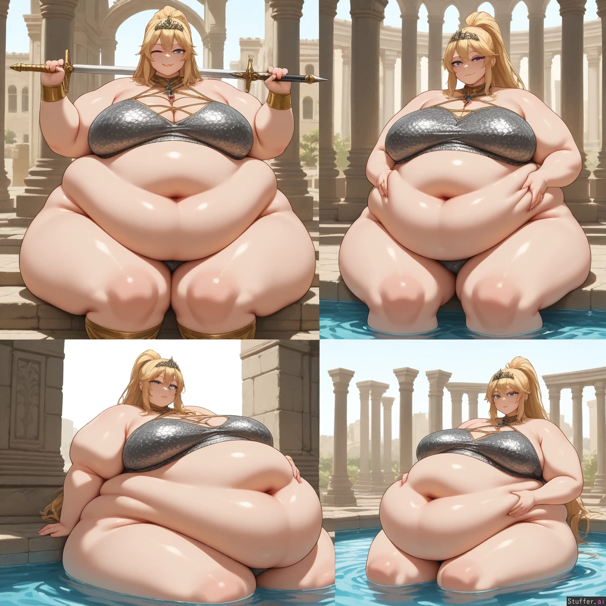 (highly detailed, best quality), (perfect anatomy, perfect proportions), beautiful face, beautiful eyes, ((( dynamic pose))),majestic graceful queen of the night zenobia,(blond high straight ponytail 3.0) ,(((detailed brigth emerald eyes))), Thin_eyes, narrow eyes,(((pure_white_color_skin))), larger_female,bright expression(High quality, ultra high definition, 8k, masterpiece, perfect hands and fingers, (((perfect clear eyes))), incredible shading and lighting),big lavish crown jewels all over her body, bellyheavy, exquisite lighting, full body,((low hanging massive belly)), (((big_very_tall))),larger female, adult, (((flabby_enlarged_belly,fat_belly,double belly))),((( flabby_deep_fat_rolls_))) larger_female,((soft_arms,fat_arms)), obese,, ,((((silver_metallic_chainmail )))), (((, hyper plump, morbidly obese,fat arms,belly_rolls,fat_rolls ))), (((tall))), adult, (( massive double belly)),(((has a flabby_waist with deep fat_rolls_))) //Action// ((( weight gain progression from slim to chubby to fat to massiv ,comparison ))), (((rubbing belly))) ,(((wink))),((( sitting in pool in ancient eastern ruins))), swimming,((( partially submerged))),(((holding_sword,holding long_silver_sword))),(((not more than one navel))),(perfect anatomy, perfect proportions)