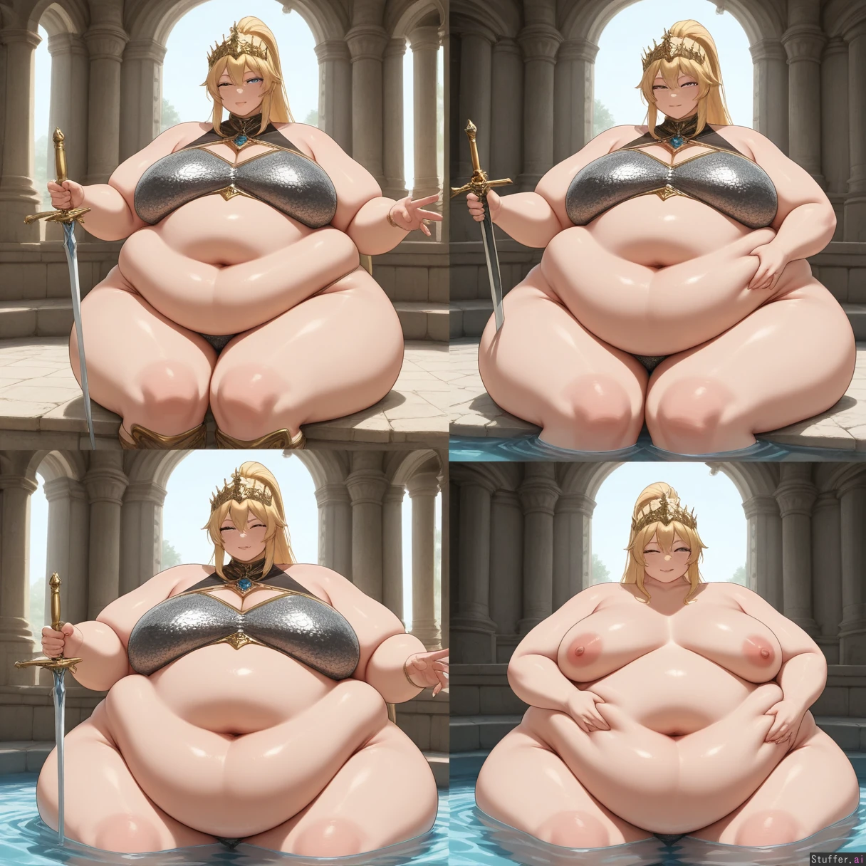 (highly detailed, best quality), (perfect anatomy, perfect proportions), beautiful face, beautiful eyes, ((( dynamic pose))),majestic graceful queen of the night zenobia,(blond high straight ponytail 3.0) ,(((detailed brigth emerald eyes))), Thin_eyes, narrow eyes,(((pure_white_color_skin))), larger_female,bright expression(High quality, ultra high definition, 8k, masterpiece, perfect hands and fingers, (((perfect clear eyes))), incredible shading and lighting),big lavish crown jewels all over her body, bellyheavy, exquisite lighting, full body,((low hanging massive belly)), (((big_very_tall))),larger female, adult, (((flabby_enlarged_belly,fat_belly,double belly))),((( flabby_deep_fat_rolls_))) larger_female,((soft_arms,fat_arms)), obese,, ,((((silver_metallic_chainmail )))), (((, hyper plump, morbidly obese,fat arms,belly_rolls,fat_rolls ))), (((tall))), adult, (( massive double belly)),(((has a flabby_waist with deep fat_rolls_))) //Action// ((( weight gain progression from slim to chubby to fat to massiv ,comparison ))), (((rubbing belly))) ,(((wink))),((( sitting in pool in ancient eastern ruins))), swimming,((( partially submerged))),(((holding_sword,holding long_silver_sword))),(((not more than one navel))),(perfect anatomy, perfect proportions)