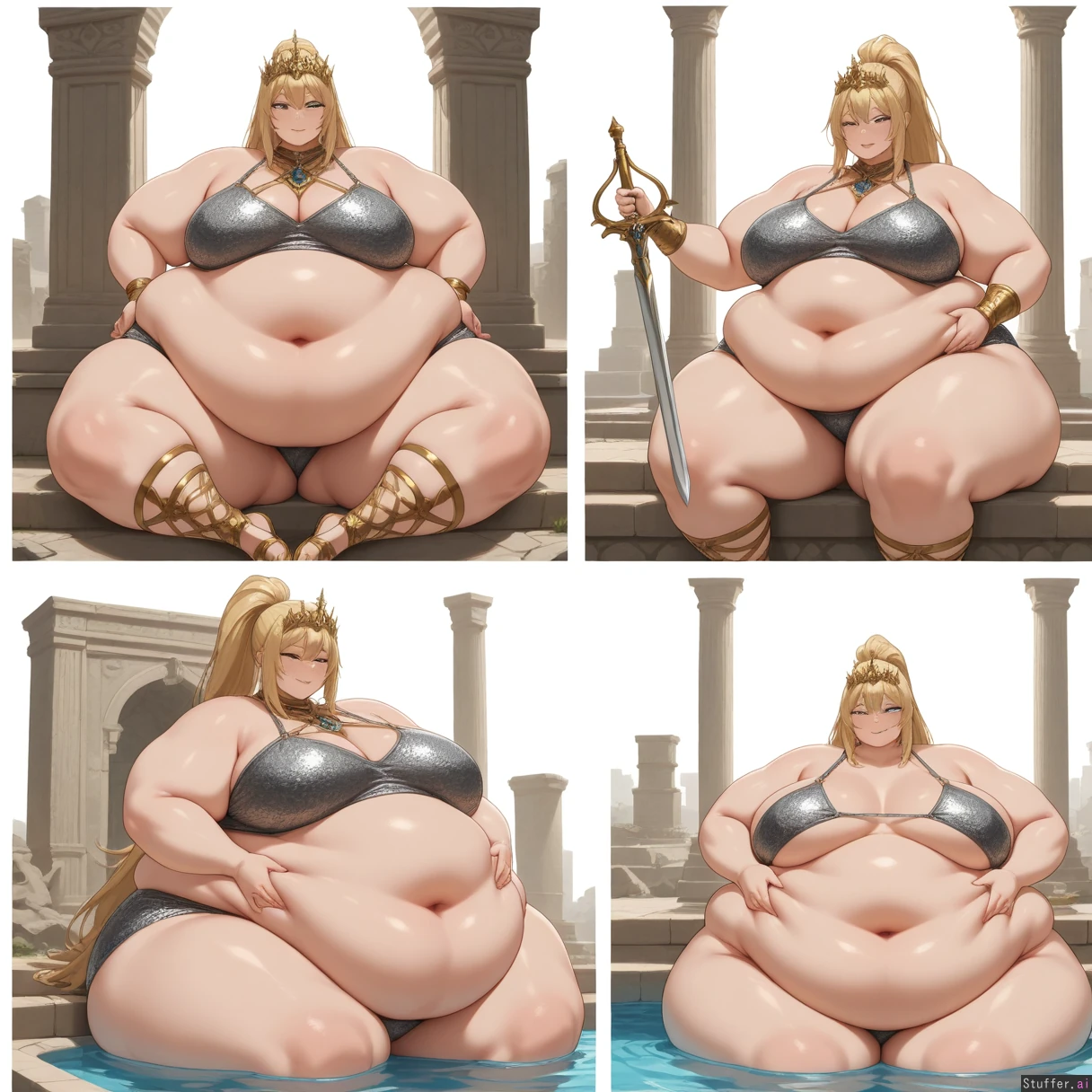 (highly detailed, best quality), (perfect anatomy, perfect proportions), beautiful face, beautiful eyes, ((( dynamic pose))),majestic graceful queen of the night zenobia,(blond high straight ponytail 3.0) ,(((detailed brigth emerald eyes))), Thin_eyes, narrow eyes,(((pure_white_color_skin))), larger_female,bright expression(High quality, ultra high definition, 8k, masterpiece, perfect hands and fingers, (((perfect clear eyes))), incredible shading and lighting),big lavish crown jewels all over her body, bellyheavy, exquisite lighting, full body,((low hanging massive belly)), (((big_very_tall))),larger female, adult, (((flabby_enlarged_belly,fat_belly,double belly))),((( flabby_deep_fat_rolls_))) larger_female,((soft_arms,fat_arms)), obese,, ,((((silver_metallic_chainmail )))), (((, hyper plump, morbidly obese,fat arms,belly_rolls,fat_rolls ))), (((tall))), adult, (( massive double belly)),(((has a flabby_waist with deep fat_rolls_))) //Action// ((( weight gain progression from slim to chubby to fat to massiv ,comparison ))), (((rubbing belly))) ,(((wink))),((( sitting in pool in ancient eastern ruins))), swimming,((( partially submerged))),(((holding_sword,holding long_silver_sword))),(((not more than one navel))),(perfect anatomy, perfect proportions)
