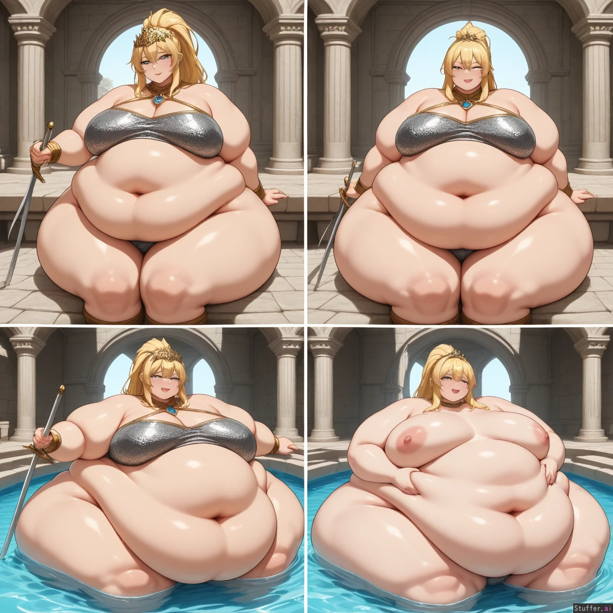 (highly detailed, best quality), (perfect anatomy, perfect proportions), beautiful face, beautiful eyes, ((( dynamic pose))),majestic graceful queen of the night zenobia,(blond high straight ponytail 3.0) ,(((detailed brigth emerald eyes))), Thin_eyes, narrow eyes,(((pure_white_color_skin))), larger_female,bright expression(High quality, ultra high definition, 8k, masterpiece, perfect hands and fingers, (((perfect clear eyes))), incredible shading and lighting),big lavish crown jewels all over her body, bellyheavy, exquisite lighting, full body,((low hanging massive belly)), (((big_very_tall))),larger female, adult, (((flabby_enlarged_belly,fat_belly,double belly))),((( flabby_deep_fat_rolls_))) larger_female,((soft_arms,fat_arms)), obese,, ,((((silver_metallic_chainmail )))), (((, hyper plump, morbidly obese,fat arms,belly_rolls,fat_rolls ))), (((tall))), adult, (( massive double belly)),(((has a flabby_waist with deep fat_rolls_))) //Action// ((( weight gain progression from slim to chubby to fat to massiv ,comparison ))), (((rubbing belly))) ,(((wink))),((( sitting in pool in ancient eastern ruins))), swimming,((( partially submerged))),(((holding_sword,holding long_silver_sword))),(((not more than one navel))),(perfect anatomy, perfect proportions)