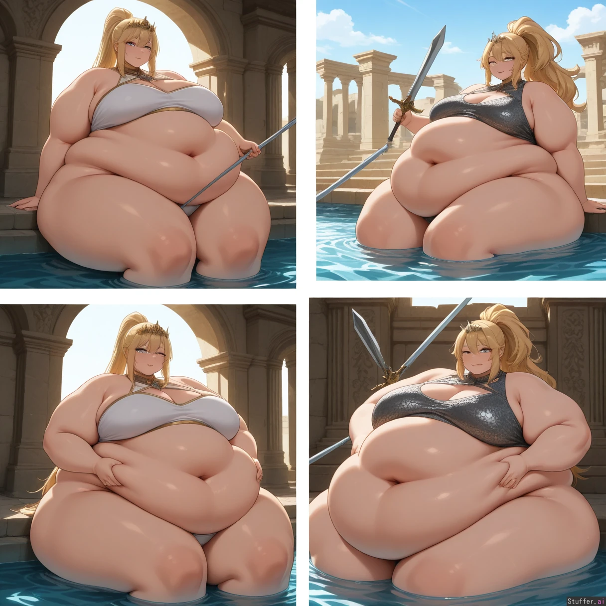 (highly detailed, best quality), (perfect anatomy, perfect proportions), beautiful face, beautiful eyes, ((( dynamic pose))),majestic graceful queen of the night zenobia,(blond high straight ponytail 3.0) ,(((detailed brigth emerald eyes))), Thin_eyes, narrow eyes,(((pure_white_color_skin))), larger_female,bright expression(High quality, ultra high definition, 8k, masterpiece, perfect hands and fingers, (((perfect clear eyes))), incredible shading and lighting),big lavish crown jewels all over her body, bellyheavy, exquisite lighting, full body,((low hanging massive belly)), (((big_very_tall))),larger female, adult, (((flabby_enlarged_belly,fat_belly,double belly))),((( flabby_deep_fat_rolls_))) larger_female,((soft_arms,fat_arms)), obese,, ,((((silver_metallic_chainmail )))), (((, hyper plump, morbidly obese,fat arms,belly_rolls,fat_rolls ))), (((tall))), adult, (( massive double belly)),(((has a flabby_waist with deep fat_rolls_))) //Action// ((( weight gain progression from slim to chubby to fat to massiv ,comparison ))), (((rubbing belly))) ,(((wink))),((( sitting in pool in ancient eastern ruins))), swimming,((( partially submerged))),(((holding_sword,holding long_silver_sword))),(((not more than one navel))),(perfect anatomy, perfect proportions)