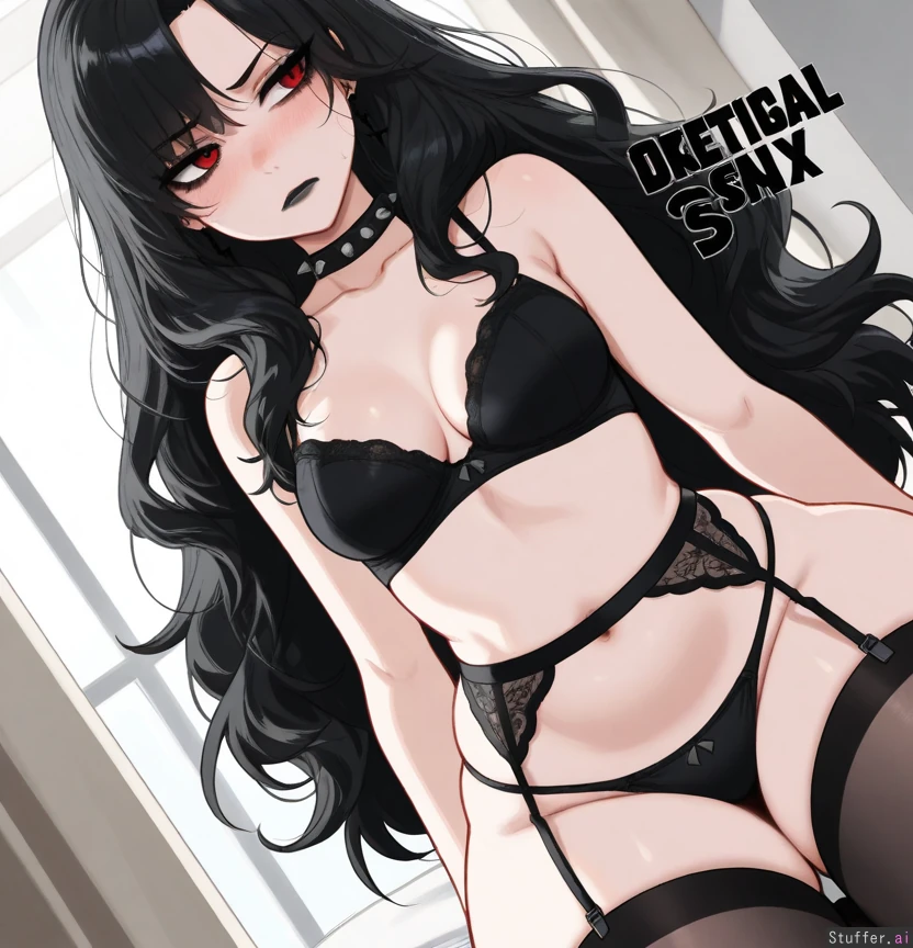 masterpiece. best quality. ultra-detailed. 16k. trending on Pixiv. score_1. score_9. score_8. score_7. modern/contemporary art. anime style. manga style. perfect 2D art. modern 2D stylized look. high rating. HDR. UHD. smooth texture. absurd res. anime screen cap. anime extract. 1080p. intricate detail. highly detailed. sophisticated quality. detailed lighting. best lighting. light diffusion. best shading. official art. official style. realistic line art. Lewdlemage(artist:1.3), betterwithsalt(artist:1.3), usa37107692(artist:1.3), KipTeiTei(artist:1.3), blushyspicy(artist:1.3), spellsX(artist:1.3), Hews(artist:1.3), krekkov(artist:1.3), KAMII MOMORU(artist:1.3). (1women). (pale skin tone). (goth women). (Tsundere). (the face is getting beat red from blushing:1.1). (looking away). (jet black hair, long hair, wavy hair). (gothic makeup). (black lipstick). (red eyes). (Small breasts, large MILF body, large voluptuous body, large THICC body, large curvy body, wide hips, mega hips, huge ass, giant ass). (Round belly) mature look. (Dutch angle, cowboy shot). (wearing a spiked choker). (wearing a fancy garter belt). (kneeling). (bedroom). (1guy shyly looking at 1women).