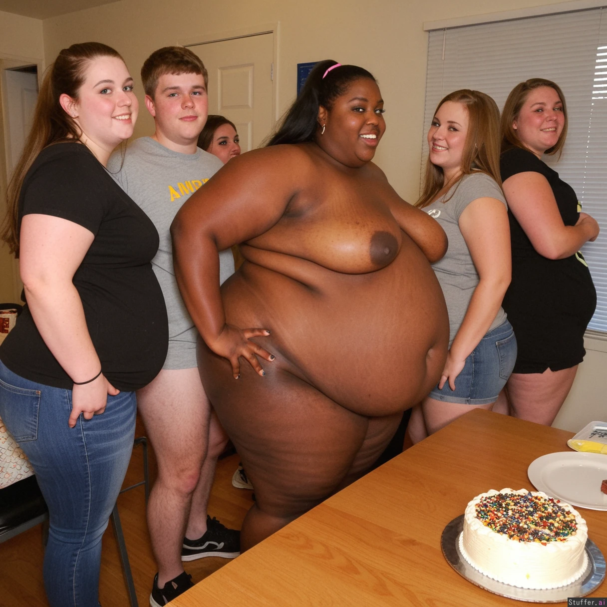 College Instagram photo, American college girl, morbidly obese, 21-years-old, side view, Standing and posing with overweight college friends in her dorm at a dorm overeating party, too much fat cake, , hyper_belly