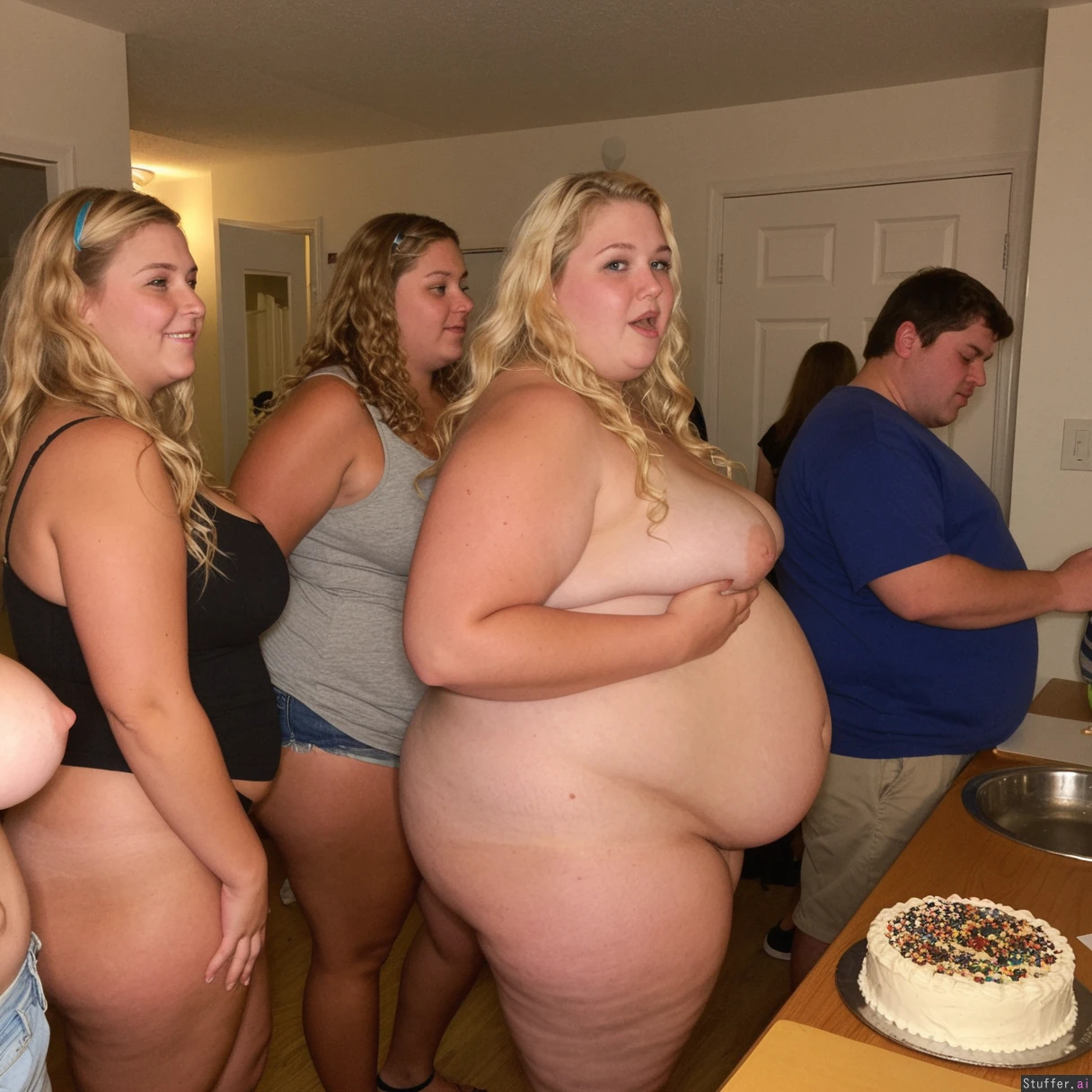 College Instagram photo,blond wavy hair American college girl, morbidly obese, 21-years-old, side view, Standing and posing with overweight college friends in her dorm at a dorm overeating party, too much fat cake, , hyper_belly