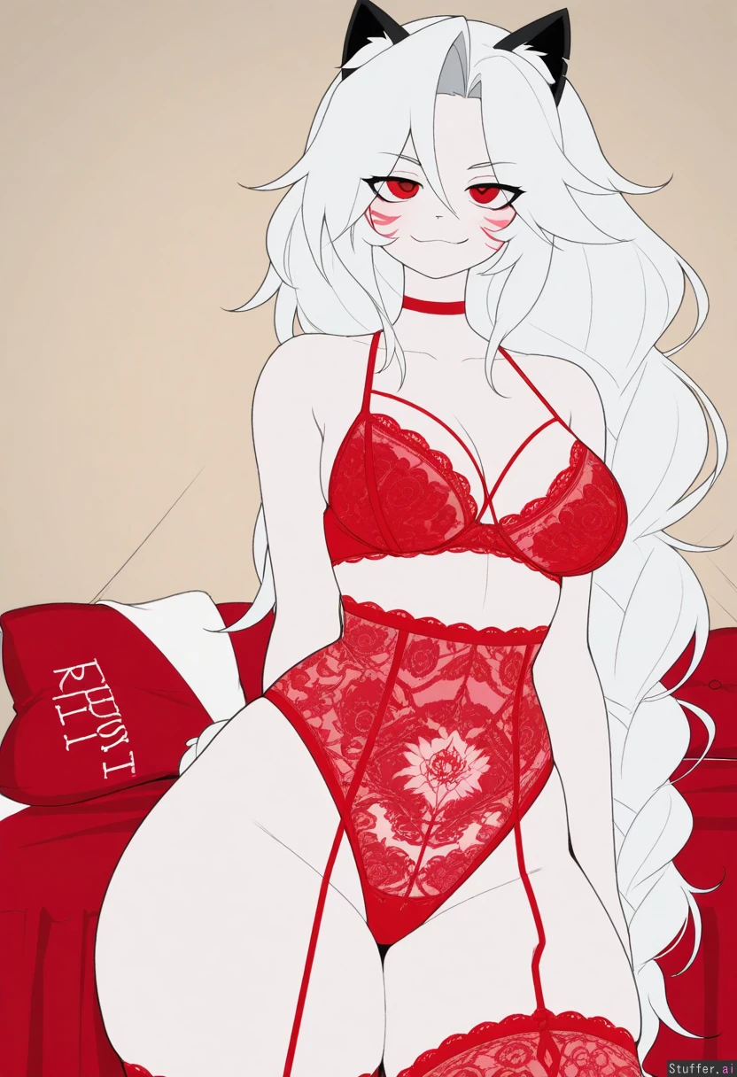 8k, masterpiece, beautiful eyes, ((theycallhimcake)), ((absurdes)), ((RockSolidArt)), ((merunya)), ((ohasi_art)), ((betterwithsalt)), ((usa37107692)), ((flat color:1.5)) ((Solo))((Furry, anthro))((Loona_helluvaboss:1.75)) ((Cute, sexy, mature)) ((White hair, red eyes, messy hair, one huge braid, long hair)) ((Red lingerie)) ((Bedroom)) ((Smug, seductive, provocative, sensual, flirty)) (Standing) ((Medium breasts)) ((Obese, chubby belly, huge hips, thick thighs:0.7))
