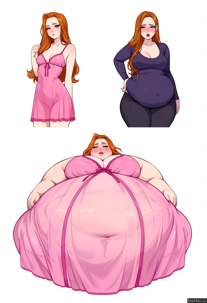 perfect anatomy, ((((Solo)))), Ultra High Definition, Impeccable Detail, Premier Quality, Top quality, (perfect anatomy), Expressive, ((25 years old)), (solo), (extremely attractive), ((female)), (heavy makeup), pale_skin, @blushyspicy, ((@prywinko)), @Kittew, @icarusillustration, @waltzpurgis, Ginger hair, silky hair parted in the middle, blue eyes, (((pink translucent nightgown))), forehead, (pale skin) ((((weight gain before and after)))), ((from skinny to enormously morbidly obese ussbbw girl)), before: ((skinny, pretty, small, medium breasts, lithe, shy, blushing, uncertain expression, modest, fit, thin)), after: ((huge Round fat belly:1.7)), ((worried expression)), blushing, belly_overhang, hip_dips, (half-closed_eyes), ((morbidly_obese)), ((fat_arms)), (((open_mouth))), hips_wider_than_shoulders, button_gap, hand_on_own_chest