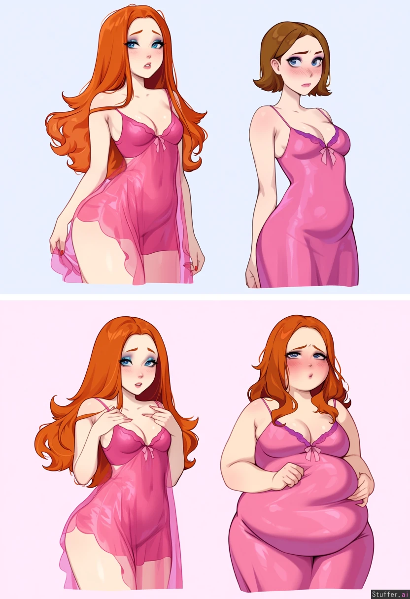 (2 panels), perfect anatomy, ((((Solo)))), Ultra High Definition, Impeccable Detail, Premier Quality, Top quality, (perfect anatomy), Expressive, ((25 years old)), (solo), (extremely attractive), ((female)), (heavy makeup), pale_skin, @blushyspicy, ((@prywinko)), @Kittew, @icarusillustration, @waltzpurgis, Ginger hair, silky hair parted in the middle, blue eyes, (((pink translucent nightgown))), forehead, (pale skin) ((((weight gain before and after)))), ((from skinny to morbidly obese ssbbw girl)), before: ((skinny, pretty, small, medium breasts, lithe, shy, blushing, uncertain expression, modest, fit, thin)), after: ((soft fat belly:1.7)), ((worried expression)), blushing, belly_overhang, (half-closed_eyes), ((morbidly_obese)), ((fat_arms)), (((open_mouth))), hips_wider_than_shoulders, button_gap,