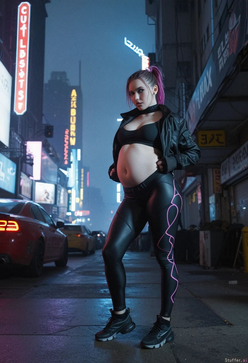 fully dressed,cyberpunk, full_body, pants, seductive_look, futuristic city, cyberpunk, piercing, leggings, jacket, sidebelly, legs_together, inflated_belly