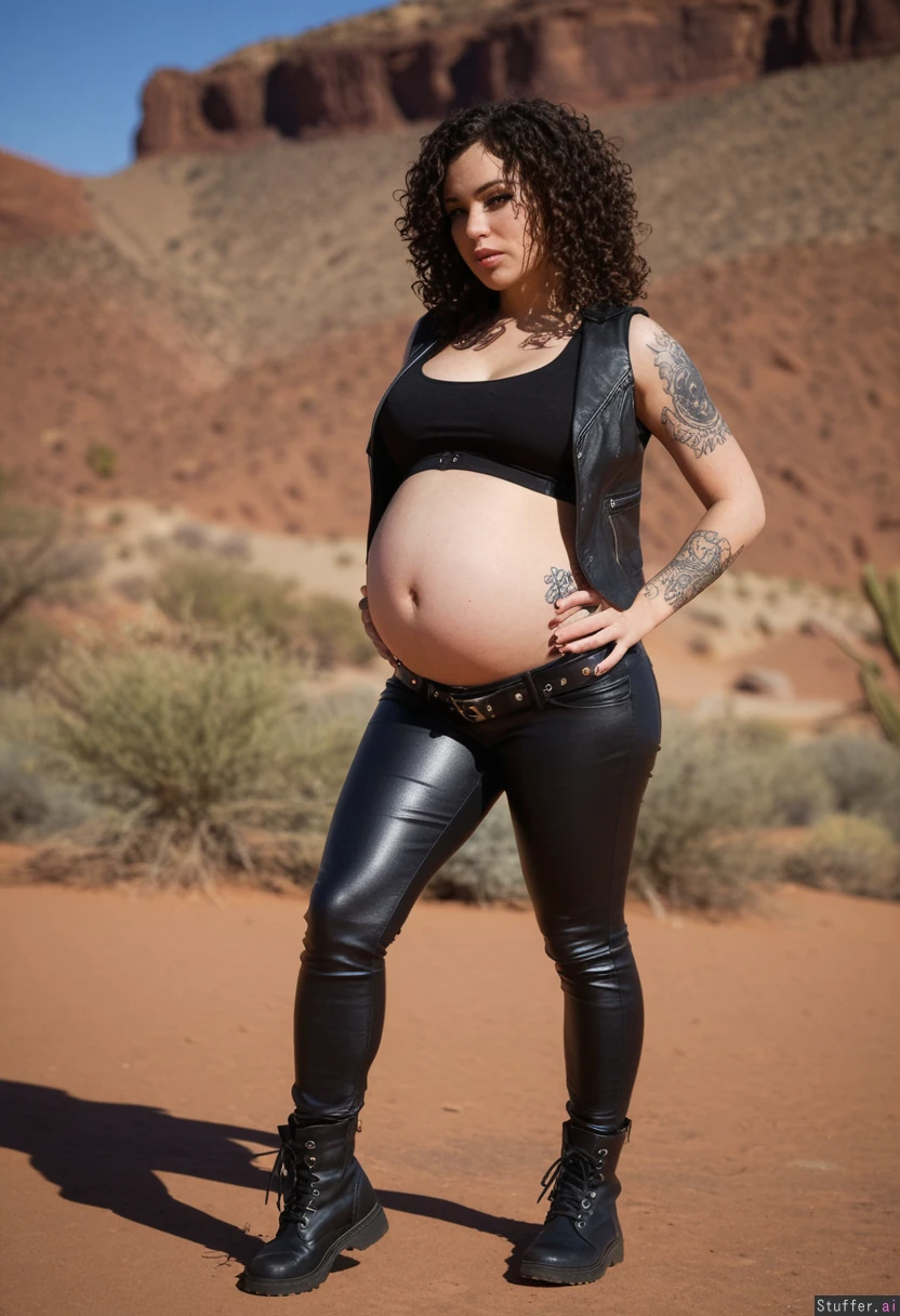 ((Ultra realistic shadows, ultra realistic lighting, ultra realistic hands, ), (16K, UHD, HDR, masterpiece, soft focus, high rating), fully dressed, tattoed, piercing, fully_clothed, shirt; vest, huge_belly, pregnant, tank_top, full_body, leather_belt, desert, long_legs, curly_hair, latina