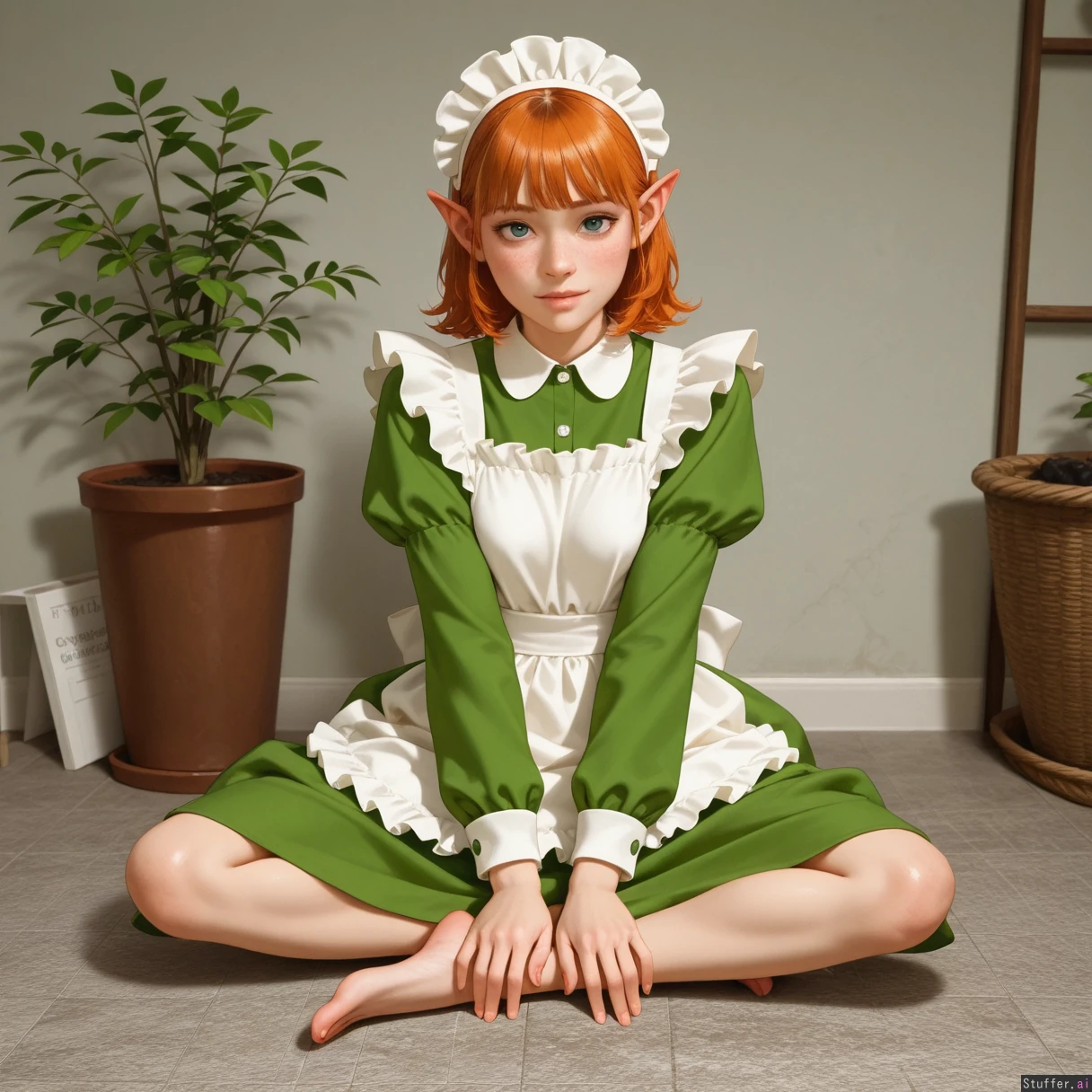 Garden, semi-realistic. Ginger, pointed ears, freckles, green milk maid dress, barefoot. Shortstack. Looking at viewer, joyful.