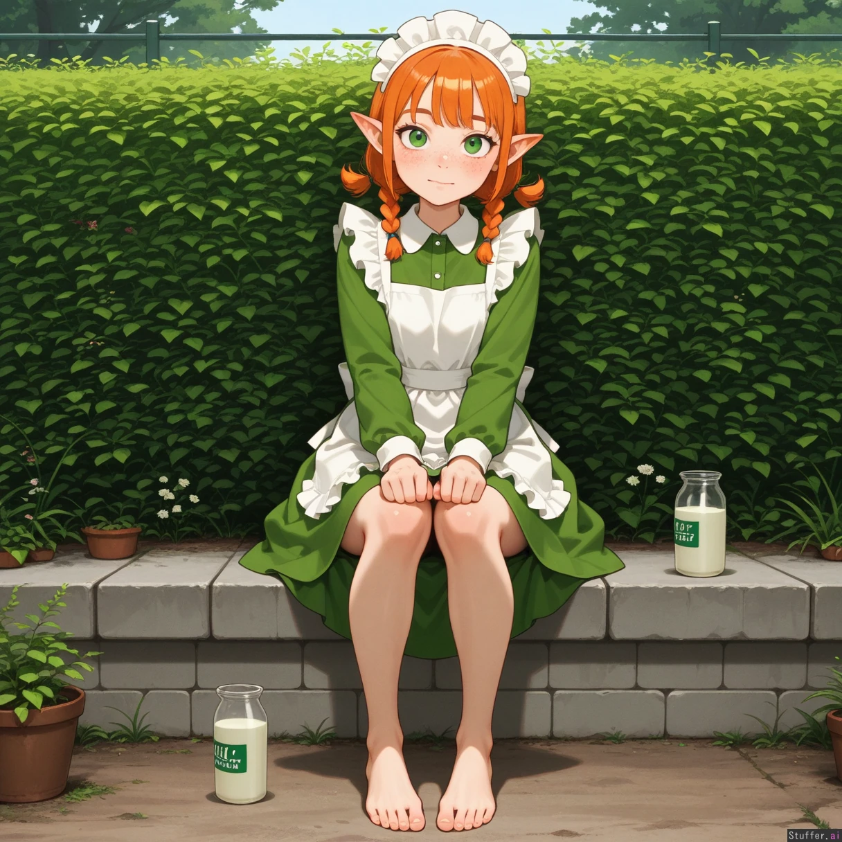 Outside, garden. Ginger, pointed ears, freckles, green milk maid dress, barefoot. Shortstack. Looking at viewer, joyful.