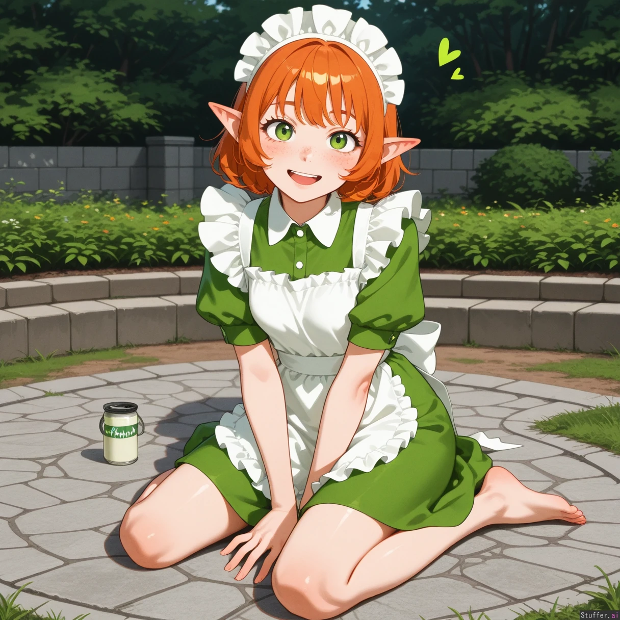Outside, garden. Ginger, pointed ears, freckles, green milk maid dress, barefoot. (Shortstack). Looking at viewer, flirty, smiling, open mouth.
