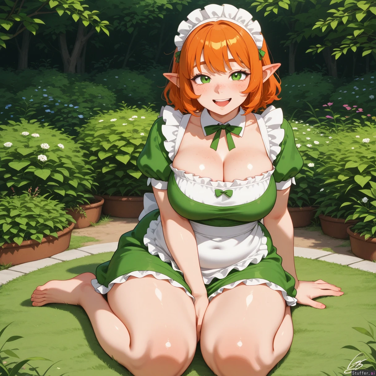 Outside, garden. Ginger, pointed ears, freckles, green milk maid dress, barefoot. (Shortstack), ((plump)). Looking at viewer, flirty, smiling, open mouth.