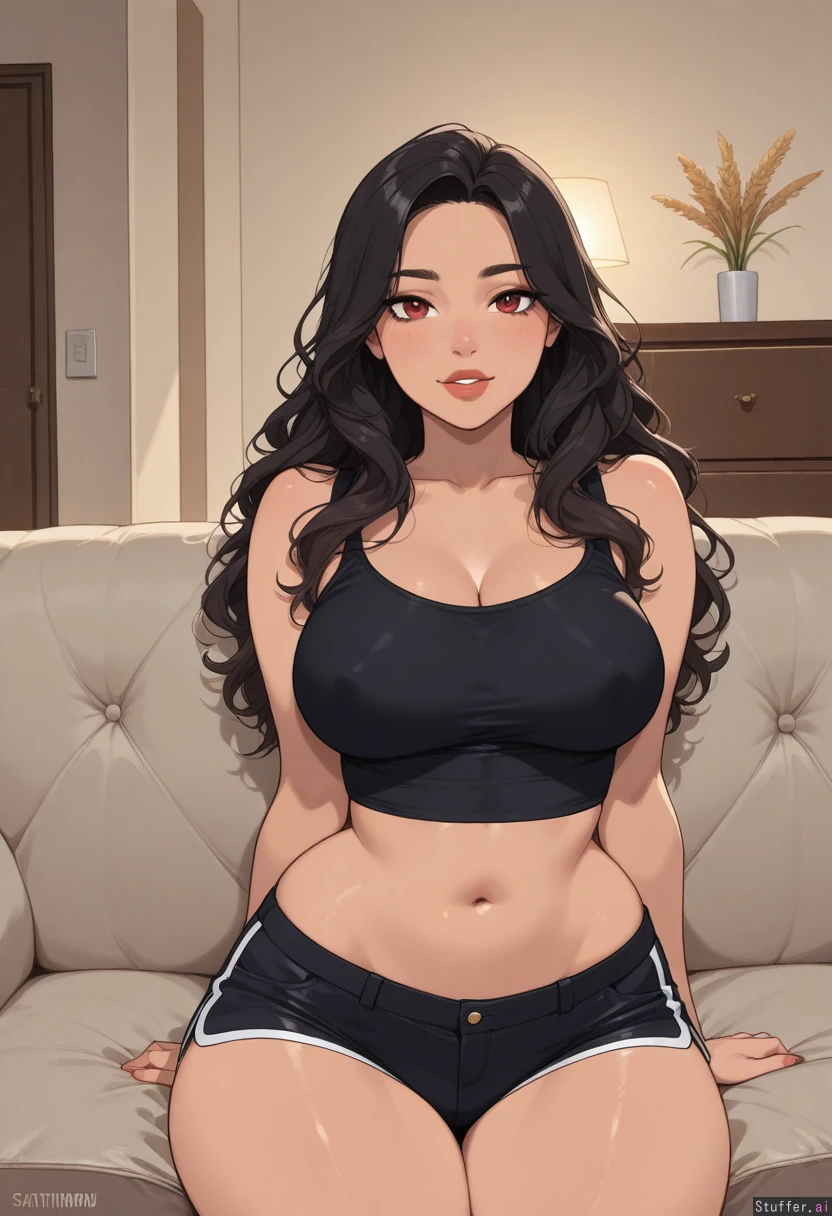 (Highly detailed, KAMII MOMORU(artist), high quality shading, warm lighting, flat colors, defined lines beautiful eyes, beautiful lips) ((latina girl, black wavy hair, wide hips, medium tits, full lips, soft makeup, red eyes, Wheat-colored skin)) (((living room, satting in sofa, black croptop, Short shorts)))