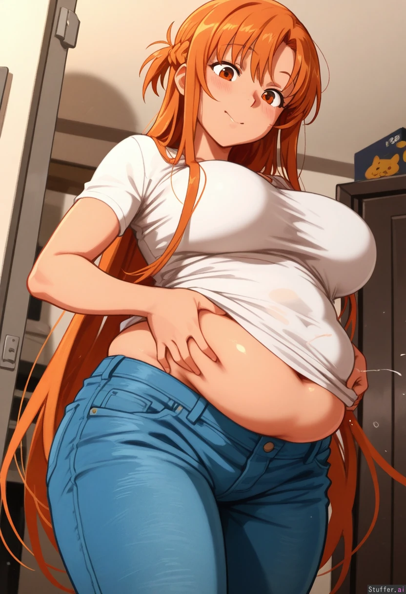 Potbelly Asuna, masterpiece, beautiful face, beautiful eyes, khyle. /(artist/) , 1girl, solo, tall female:1.8), Asuna SAO, orange hair, orange eyes, potbelly, curvy, plumper, orgasm face, blue jeans, bloated, first person looking down, tight shirt, fat belly, weight gain, potbelly, ((belly_grab)), skindentation