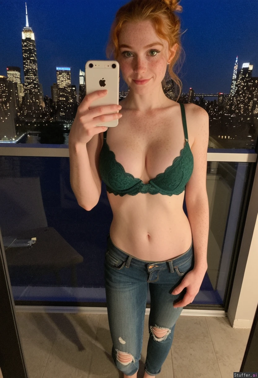 A sexy 21 yo (very feminine face) ginger with long wavy hair and freckles , snub short nose, pointy chin, almond shaped green eyes, eyes slightly wide apart, bushy eyebrows, hair tied in messy bun wearing a dark green lace bra, very baggy loose jeans (no rips or holes), standing taking a selfie, barefoot toes painted white. Full body view, huge lips with heart shape She is a shortstack , pear-shaped_figure , (narrow hips) (8% body fat) (full breasts) (fit) (skinny) She is happy and looking down at breasts Realistic, iPhone 5 blurry quality , real_life, location is luxury apartment at night time with New York skyline