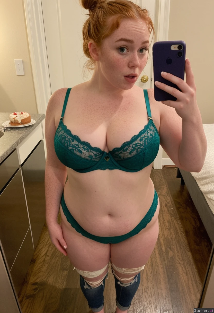 A sexy 21 yo (very feminine face) ginger with long wavy hair and freckles , snub short nose, pointy chin, almond shaped green eyes, eyes slightly wide apart, bushy eyebrows, hair tied in messy bun wearing a tight dark green lace bra, ripped green lace panties, jeans down by ankles (no rips or holes), standing taking a selfie, barefoot toes painted white. Full body view, huge lips with heart shape She is a shortstack , pear-shaped_figure , (wide hips) (20% body fat) (full breasts) ), plump belly, face is bloated double chin She is shocked looking, very wet body Lots of cakes on floor Realistic, iPhone 5 blurry quality , real_life, location is luxury apartment at night time with New York skyline