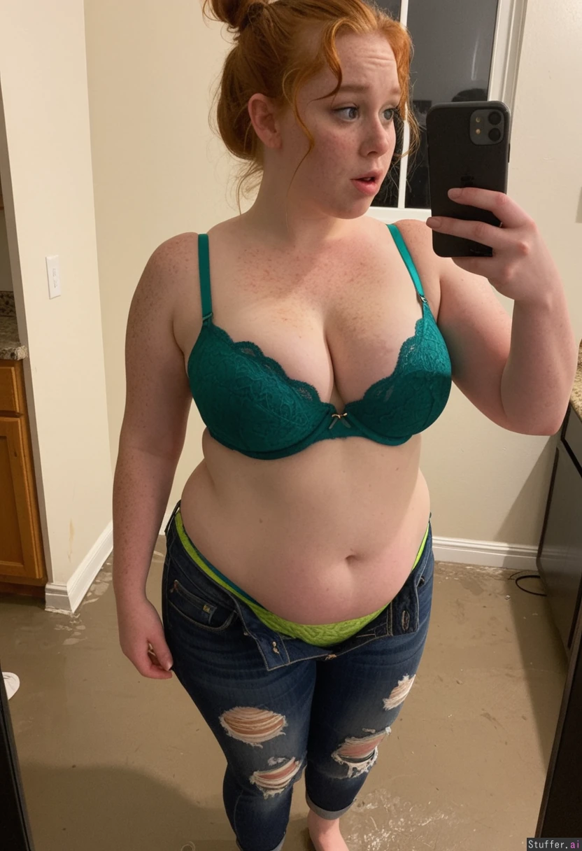 A sexy 21 yo (very feminine face) ginger with long wavy hair and freckles , snub short nose, pointy chin, almond shaped green eyes, eyes slightly wide apart, bushy eyebrows, hair tied in messy bun wearing a tight dark green lace bra, ripped green lace panties, jeans down by ankles (no rips or holes), standing taking a selfie, barefoot toes painted white. Full body view, huge lips with heart shape , pear-shaped_figure , (wide hips) (20% body fat) (full breasts) ), plump belly, face is bloated double chin, side profile, obese She is shocked looking, drenched in water Lots of cakes on floor Realistic, iPhone 5 blurry quality , real_life, location is luxury apartment at night time with New York skyline