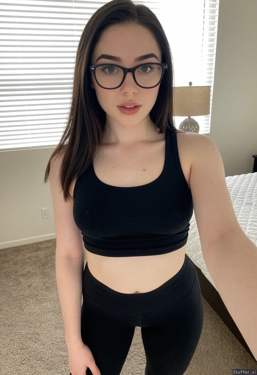 Selfie 26 year old Pale_skin Shoulder length hair, black hair, (Rectangle glasses, brown eyes, smooth skin, wide_jaw, thick_full_lips, lips parted , teeth slightly visible, thick arched eyebrows, wide nose, , strong chin, dimples ) Small breasts, narrow hips, (Broad Wide shoulders,) ((weight gain: 1.1)) Bedroom Shocked, she is holding her hips Black tank top, gym leggings Full body view standing next to window,