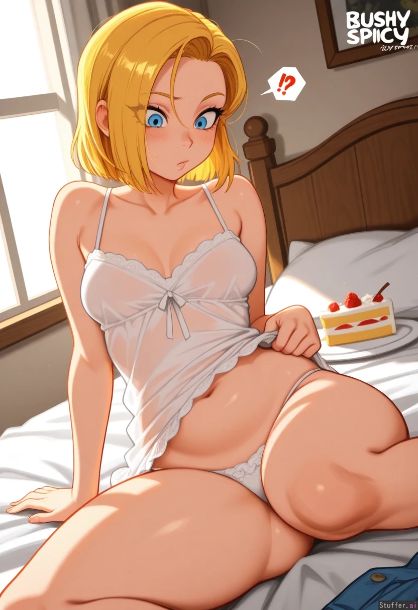 Android 18) ,best quality , smooth skin ,(khyle(artist):0.6) , (masterpiece), (gardegu /(artist/):1.1), (blushyspicy(artist):0.7) , (usa37107692:0.5) ,1girl, solo , small breasts , bedroom , bed, small belly, no belly roll. , belly exposed, silk nightdress, sitting, cake_slice , surprised, fit woman, facing the viewer Narrow hips, normal thighs, perky fat ass (Hips expanding:0.1), (ass expanding:1), (big belly:.1), (belly roll:0.1)