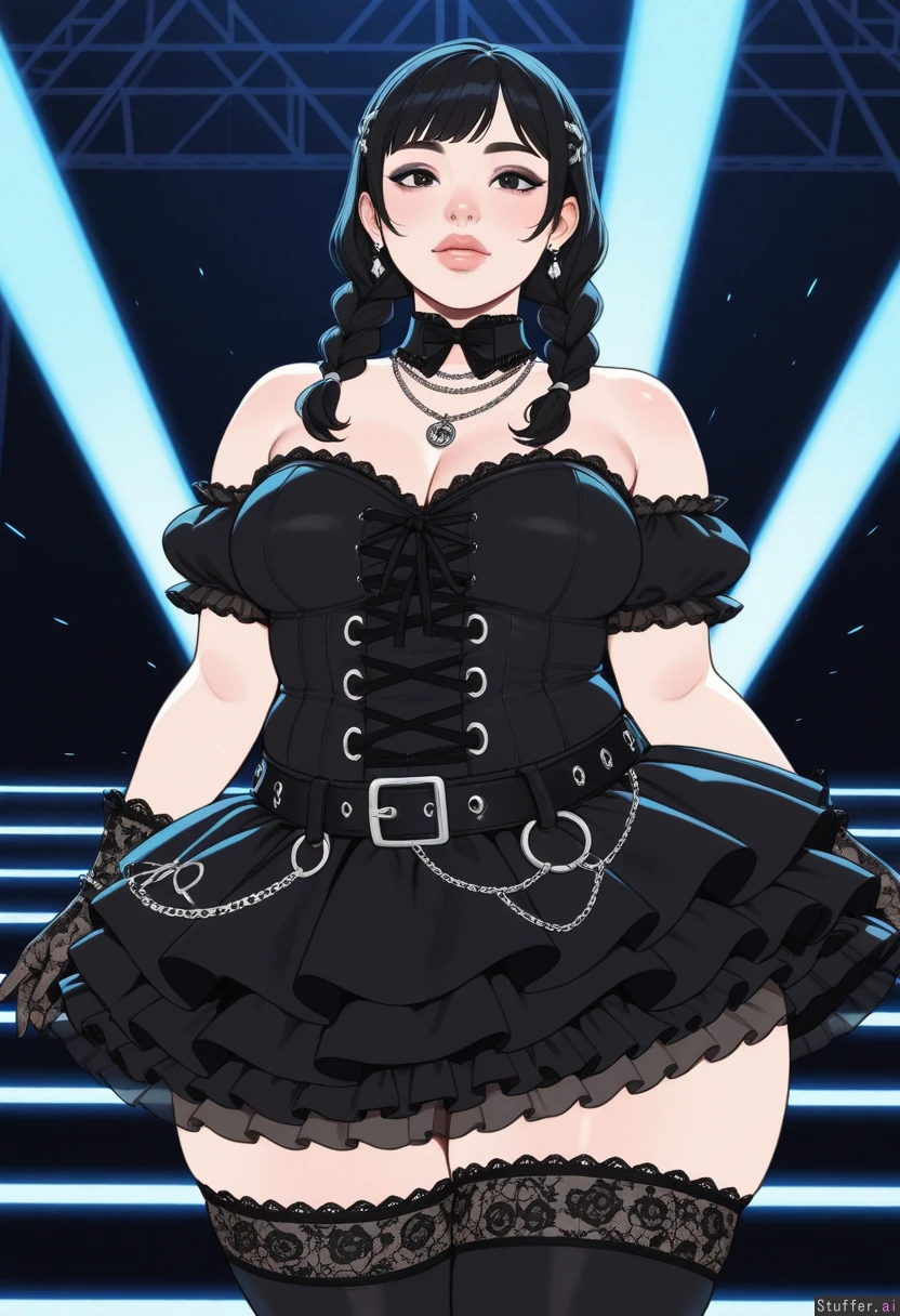 Highly detailed, KAMII MOMORU(artist), celshading, defined lines, flat colors, stage, colored light, pastel 1woman, japanese girl, (j-pop idol:1.3), goth, upturned nose, asian eyes, plump lips, lavander eyeshadow, black miniskirt, bare shoulders, Lace patterned frilled sleeves, braid pigtails, frilled skirt, black cropped frilled corset, lace bow-tie collar, necklace, earrings, black belt, chains attached to belt, lace_evening_gloves, lace bowtie in hair, lace_frilled_tigh_highs Morbidly_obese
