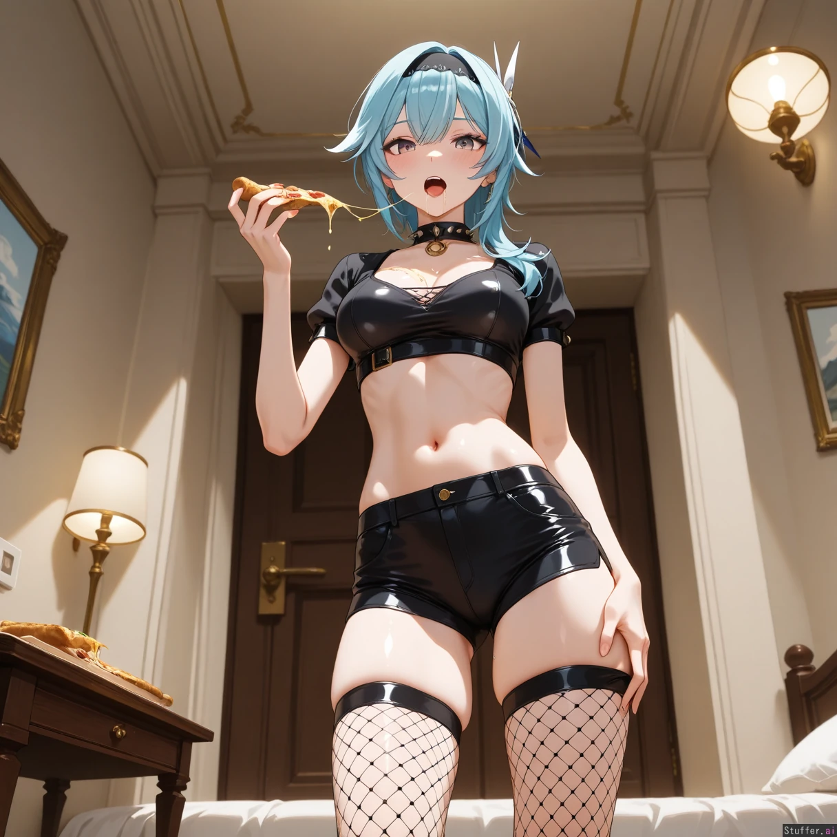 amazing quality, high resolution, in white romantic bedroom, white bed with golden arch, brown side table with white lamp, painting of lake on wall, ((below view of her thighs)), ((belly play)), "you've still skinny and sexy", (pinching thighs), eating pizza, pizza feast, thinking "it's so delicious!", salivating, open mouth, holding (pizza slice with each hand), (eating fetishism), (ridiculous amounts of food), Fat curvaceous sexy volutupus Eula_(Genshin_Impact), standing in hallway, asking "can I get more pizza?", blushing, eating pizza, looking at viewer overjoyed addicted to pizza, ((focus on body and addicted to pizza, salivating, drooling, eating nonstop)), "all of this food is making me fatten up and gain weight," tight black goth crop top with exposed cleavage, midriff exposed, black goth fishnet stockings, tight black goth jean shorts, spiked choker collar, golden hoop earrings, mascara, tall, medium breasts, narrow waist, lean slender body, ((small slender thighs)), ((skinny)), bangs,